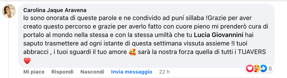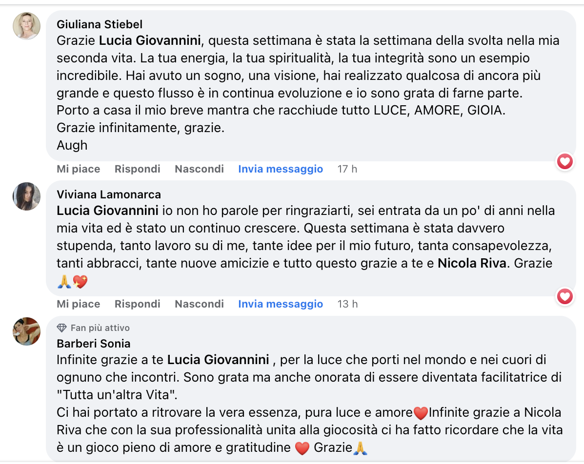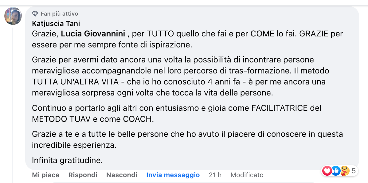 La formazione come Facilitatrice del metodo TUAV è andata oltre le mie aspettative, è teorica ma soprattutto pratica ed esperienziale in modo che i concetti e gli esercizi proposti, per migliorare la qualità della tua vita, arrivino in maniera più diretta e rimangano parte di te. Impari a gestire i cambiamenti che la vita ti propone a vederli come meravigliose opportunità di crescita e ti senti onorata di poter portare tutto ciò a più persone possibili affinché vivano anche loro davvero “Tutta Un’Altra Vita”. Le emozioni che emergono durante la settimana sono molto forti e trovare un gruppo di persone che condivide la tua missione e visione del mondo che diventa quasi una famiglia di fa sentire a casa e ti permette di esprimerti liberamente. Lucia e Nicola in questo sono molto bravi e attenti a creare un clima d’accoglienza, assenza di giudizio e nel rispetto di ognuno di noi, della nostra storia e unicità. Dai corsi BlessYou! si va a casa sempre arricchiti di tanti strumenti utili da applicare nella vita di tutti i giorni e nuove amicizie di valore con cui continuare il cammino di crescita personale.